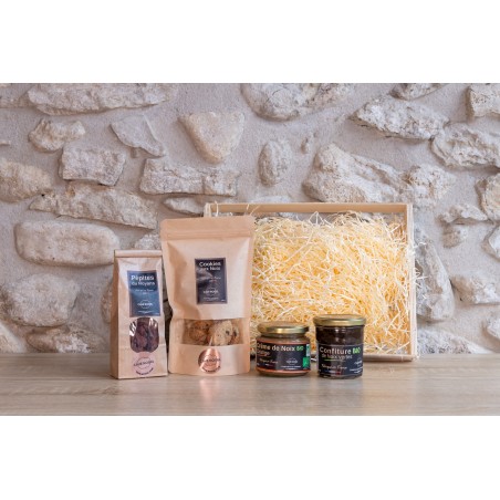 Offrez un voyage gourmand avec notre coffret cadeau artisanal, composé d’une sélection raffinée de produits aux noix. Chaque article, soigneusement élaboré à partir de noix de qualité, reflète le savoir-faire traditionnel et la richesse des saveurs authentiques. Idéal pour surprendre et ravir les amateurs de gourmandises naturelles, ce coffret incarne l’art de la dégustation conviviale et raffinée. Composé de 4 produits sucrés : Pépite du Royans 100g, Cookies aux noix 130g, Crème de noix orange Bio 200g, Confiture de noix verte Bio 200g