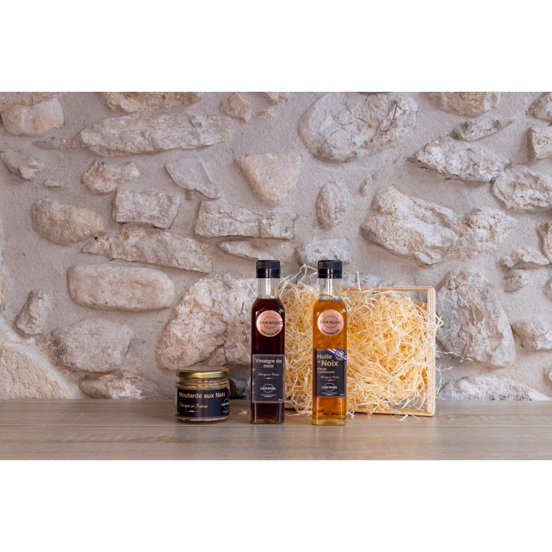 Offrez un voyage gourmand avec notre coffret cadeau artisanal, composé d’une sélection raffinée de produits aux noix. Chaque article, soigneusement élaboré à partir de noix de qualité, reflète le savoir-faire traditionnel et la richesse des saveurs authentiques. Idéal pour surprendre et ravir les amateurs de gourmandises naturelles, ce coffret incarne l’art de la dégustation conviviale et raffinée. Composé de 3 produits salés : moutarde aux noix 200g, vinaigre de noix 25cl, huile de noix vierge traditionnelle 25cl