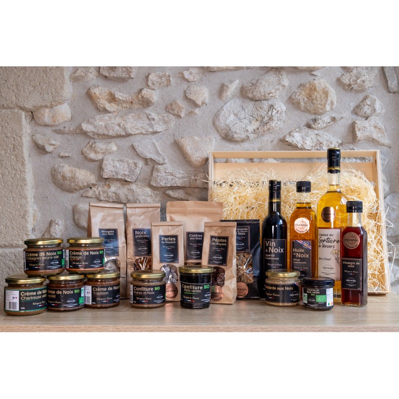 Offrez un voyage gourmand avec notre coffret cadeau artisanal, composé d’une sélection raffinée de produits aux noix. Ce coffret incarne l’art de la dégustation conviviale et raffinée. Composé de 19 produits sucrés et salés : vin & noix 37,5cl, huile de noix vierge traditionnelle 50cl, chutney de noix vertes Bio 130g, crème de noix tradition bio 200g, crème de noix orange bio 200g, noix pralinées 200g, croquants apéritifs 180g, cookies aux noix 130g, perles du Royans 100g, vinaigre de noix 25cl, crème de noix châtaigne beurre salé bio 200g, gentiane 70cl, moutarde aux noix 200g, confiture de noix verte bio 200g, crème de noix chocolat bio 200g, crème de noix chartreuse verte 200g, confiture noix poires bio 200g, nougat aux noix 125g