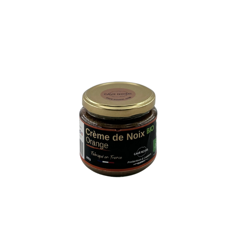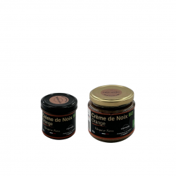 Notre crème de noix "Orange" est confectionnée à partir de noix bio, de sucre de canne bio, d'extrait naturels de Zeste d'Orange bio et de Vanille bio.