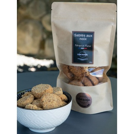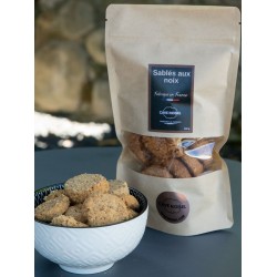 Nos sablés aux noix sont confectionnés à partir de farine, de tourteau de noix, de sucre glace, de vanille, de jaune d'œufs, de beurre, de noix brisure fine et de sel.