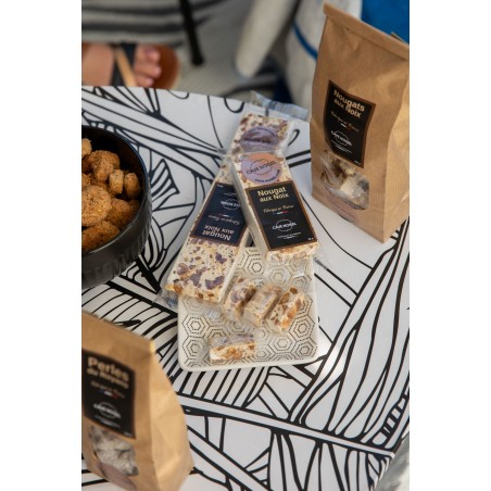 Notre nougat aux noix, tendre et généreux, marie la douceur du miel à la richesse croquante des noix soigneusement sélectionnées. Élaboré selon une recette traditionnelle, ce délice fondant offre un équilibre parfait entre douceur et caractère, idéal pour une pause gourmande ou un cadeau raffiné. Notre nougat aux noix contient du sucre, du sirop de glucose, du miel, des noix 28%, du pain azyme, de l'albumine d’oeuf et des arômes naturels de vanille.