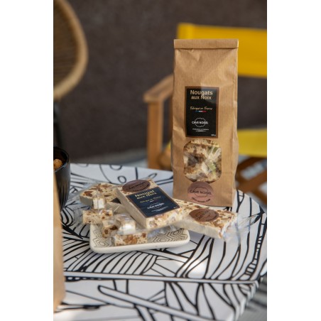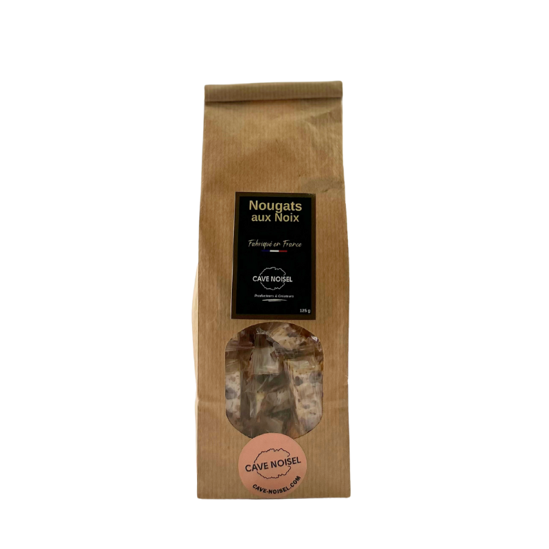 Notre nougat aux noix contient du sucre, du sirop de glucose, du miel, des noix 28%, du pain azyme, de l'albumine d’oeuf et des arômes naturels de vanille.