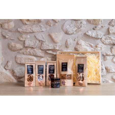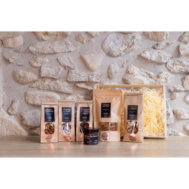 Offrez un voyage gourmand avec notre coffret cadeau artisanal, composé d’une sélection raffinée de produits aux noix. Chaque article, soigneusement élaboré à partir de noix de qualité, reflète le savoir-faire traditionnel et la richesse des saveurs authentiques. Idéal pour surprendre et ravir les amateurs de gourmandises naturelles, ce coffret incarne l’art de la dégustation conviviale et raffinée. Composé de 6 produits sucrés : Crème de noix chocolat Bio 130g, Pépites du Royans 100g, Cookies aux noix 130g, Perles du Royans 100g, Croquants aux noix 180g, Noix pralinées 100g